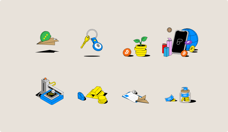 To visualize Rebind’s universe, I created a set of illustrations inspired by everyday financial objects, turning abstract crypto concepts into clear, approachable forms. Built around bold outlines, flat colors, and clean geometry, the system conveys trust and accessibility.